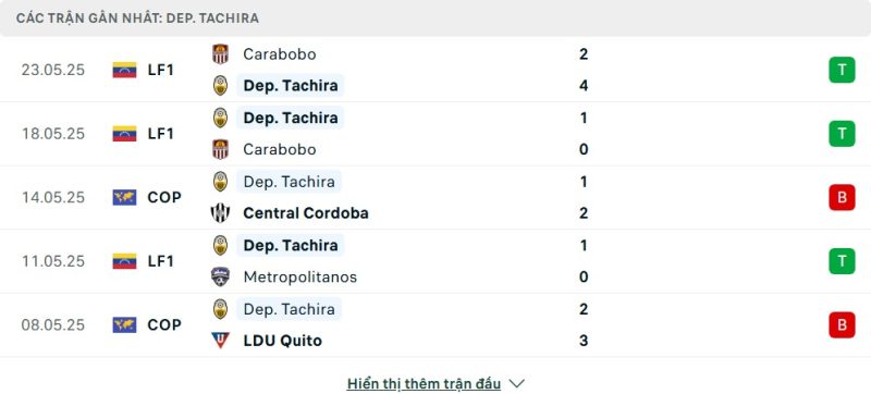 5 trận gần nhất của Deportivo Táchira: W-W-L-W-L