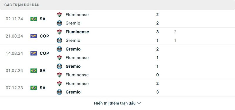 Thống kê phong độ gần đây Fluminense vs Grêmio