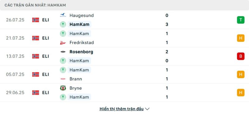 Thống kê phong độ gần đây HamKam vs Bodø/Glimt
