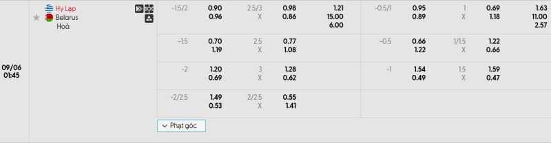 Bảng Tỷ lệ kèo bóng đá Hy Lạp vs Belarus