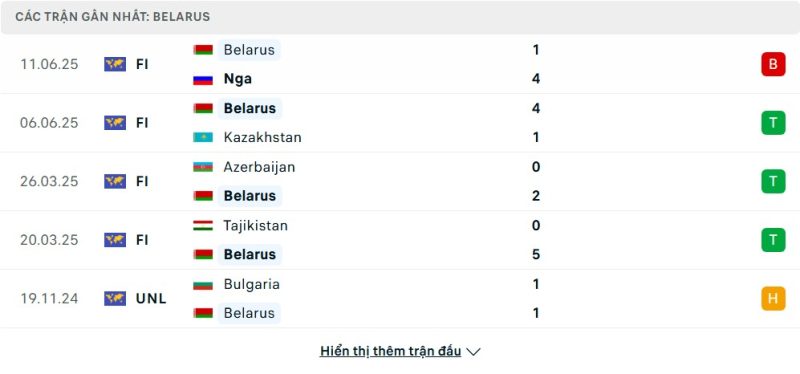 5 trận gần nhất của Belarus: L-W-W-W-D