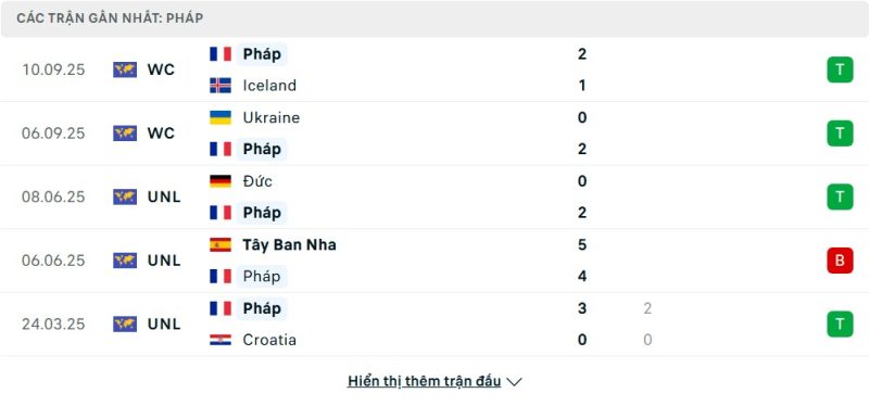 5 trận gần nhất của Pháp: W-W-W-L-W