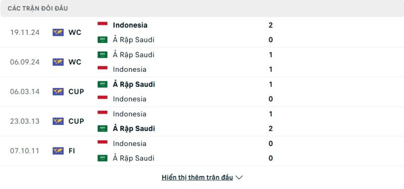 Thành tích đối đầu của Indonesia vs Ả Rập Xê Út