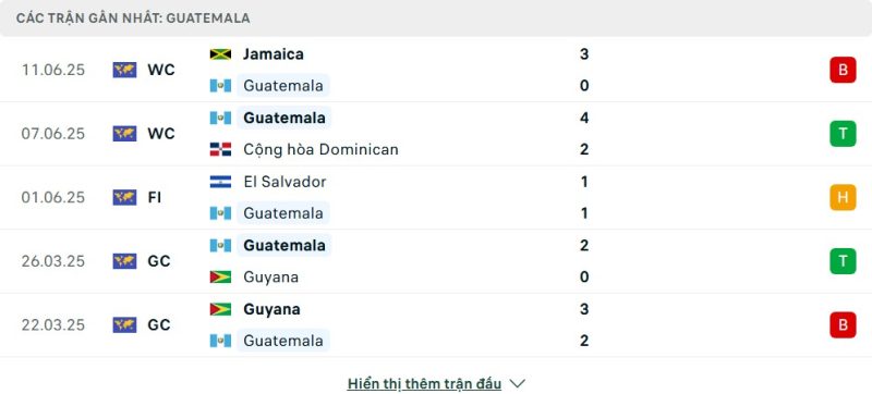 5 trận gần nhất của Guatemala: L-W-D-W-L