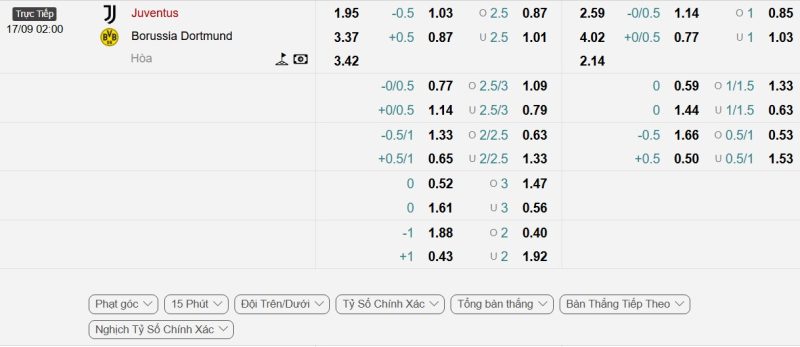 Bảng Tỷ lệ kèo bóng đá Juventus vs Borussia Dortmund