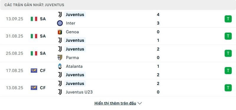 5 trận gần nhất của Juventus: W-W-W-W-W