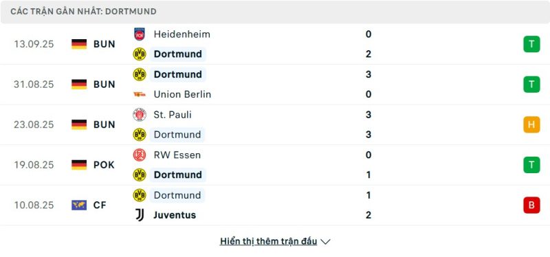 5 trận gần nhất của Borussia Dortmund: W-W-D-W-L