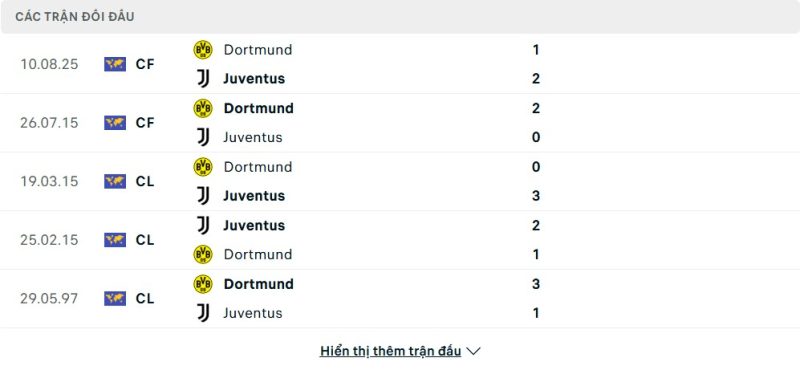 Thành tích đối đầu của Juventus vs Borussia Dortmund