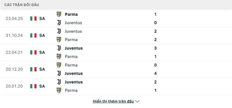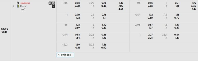 Bảng Tỷ lệ kèo bóng đá Juventus vs Parma