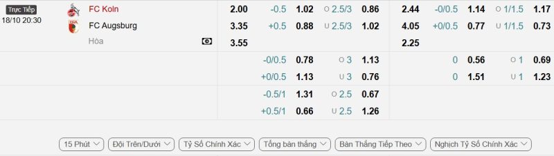 - Kèo tỷ số bóng đá hiệp 1: Köln 1-1 FC Augsburg