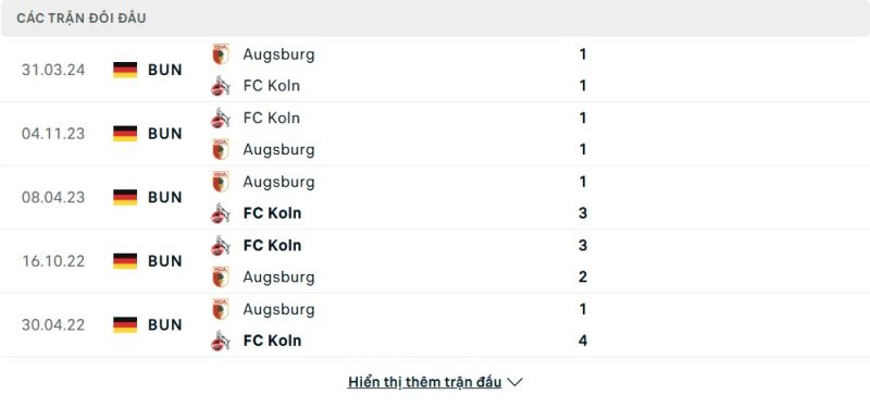 Thống kê phong độ gần đây Köln vs FC Augsburg