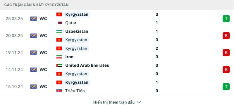 5 trận gần nhất của Kyrgyzstan: W-L-L-L-W