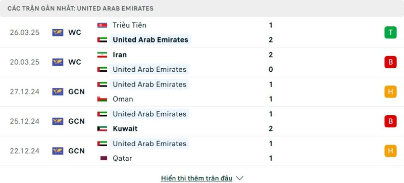 5 trận gần nhất của UAE: W-L-D-L-D