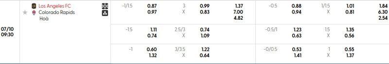 Bảng Tỷ lệ kèo bóng đá Los Angeles FC vs Colorado Rapids