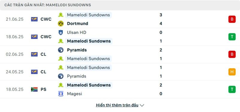 Mamelodi Sundowns khởi đầu Club World Cup 2025 với chiến thắng 1-0 trước Ulsan HD. Tuy nhiên, niềm vui đó nhanh chóng bị thử thách khi họ chạm trán Borussia Dortmund ở lượt 2. Dù sớm vươn lên dẫn trước, đại diện Nam Phi không thể duy trì thế trận và để thua 3-4 trong một trận đấu giàu cảm xúc. Sau 2 lượt, họ có được 3 điểm và hiệu số bằng 0. Dù không mất quyền tự quyết, Sundowns sẽ phải giành chiến thắng trong lượt cuối nếu muốn nuôi hy vọng đi tiếp, một nhiệm vụ đầy khó khăn khi đối thủ sắp tới là Fluminense, đội đang giữ ngôi đầu bảng.