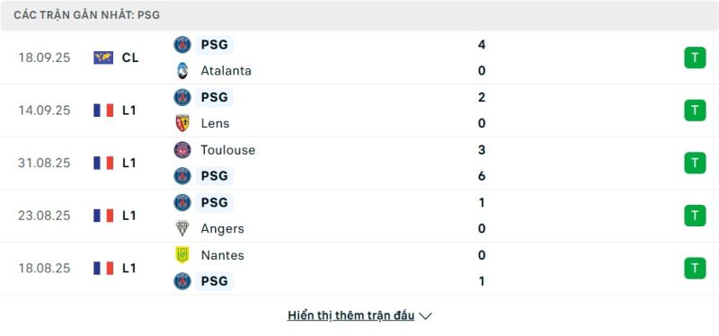 5 trận gần nhất của Paris Saint-Germain: W-W-W-W-W