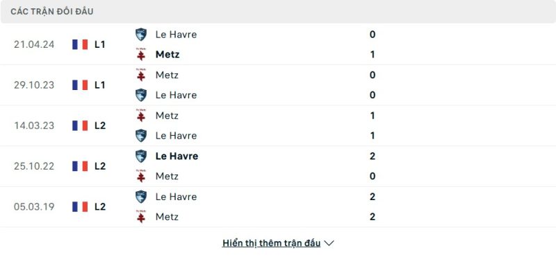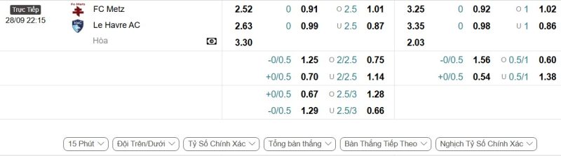 Bảng Tỷ lệ kèo bóng đá Metz vs Le Havre
