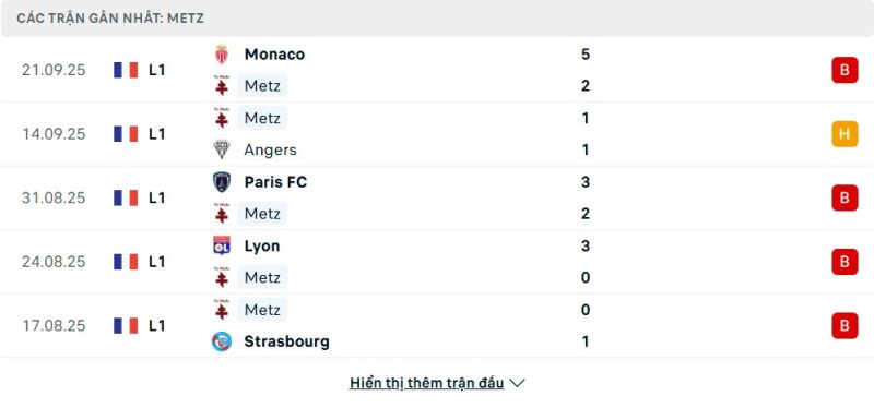 Metz đang trải qua giai đoạn đầu mùa giải vô cùng khó khăn khi chỉ giành được duy nhất một điểm sau 5 vòng đấu. Đội bóng này xếp cuối bảng với chuỗi trận liên tiếp toàn thua và hòa. Trận hòa 1-1 trước Angers là điểm sáng hiếm hoi, nhưng ngay sau đó họ lại nhận thất bại nặng nề trước AS Monaco với tỷ số cách biệt. Hàng thủ của Metz để lọt lưới quá nhiều, khiến cho nỗ lực nơi hàng công trở nên vô nghĩa. Đứng áp chót bảng xếp hạng, áp lực dồn nén đang khiến tâm lý các cầu thủ trở nên nặng nề.