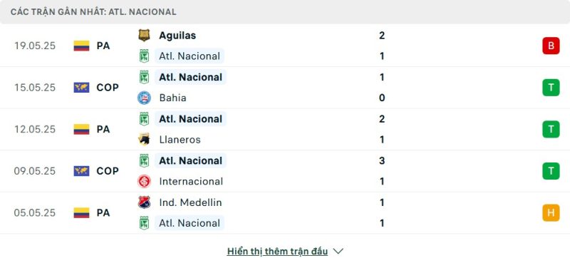 Thành tích đối đầu của Nacional vs Atlético Nacional