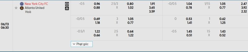 Bảng Tỷ lệ kèo bóng đá New York City FC vs Atlanta United