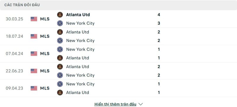 Hai lần đối đầu gần nhất giữa New York City FC và Atlanta United đều chứng kiến rất nhiều bàn thắng. Cụ thể, cả hai trận đều kết thúc với tổng cộng hơn 3 bàn thắng được ghi, thể hiện rõ sự cởi mở trong lối chơi và tâm lý sẵn sàng chơi sòng phẳng giữa hai đội. Những cuộc đối đầu này thường diễn ra với thế trận giằng co, ăn miếng trả miếng liên tục và không thiếu các pha bóng hấp dẫn. Sự cân bằng trong những lần gặp nhau gần đây cũng khiến trận đấu tới càng trở nên khó lường.
