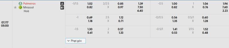 Bảng Tỷ lệ kèo bóng đá Palmeiras vs Mirassol