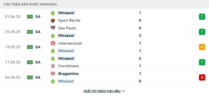 Thống kê phong độ gần đây Palmeiras vs Mirassol