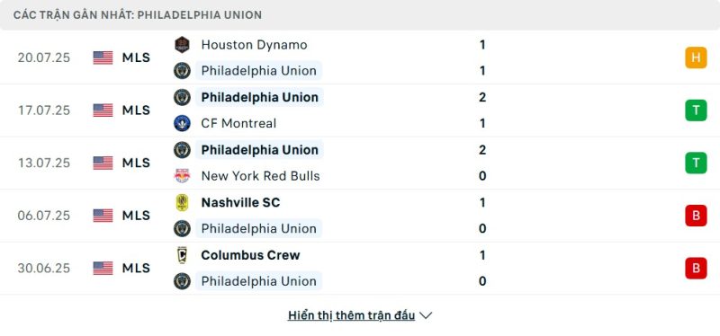 5 trận gần nhất của Philadelphia Union: D-W-W-L-L