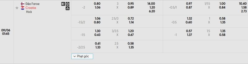 Bảng Tỷ lệ kèo bóng đá Quần đảo Faroe vs Croatia