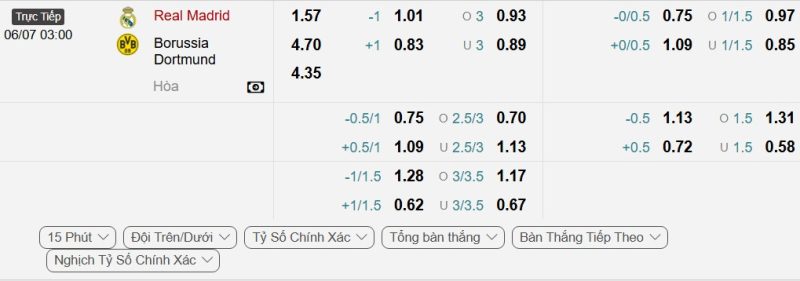 - Kèo tỷ số bóng đá hiệp 1: Real Madrid 0-1 Borussia Dortmund