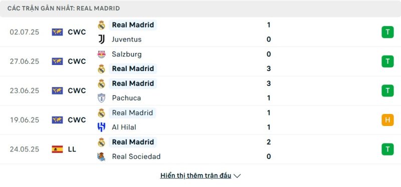 5 trận gần nhất của Real Madrid: W-W-W-D-W