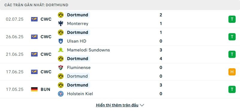 5 trận gần nhất của Borussia Dortmund: W-W-W-D-W