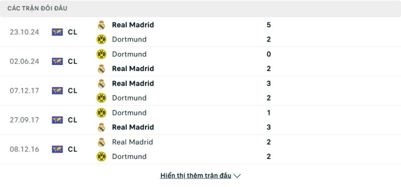 Thành tích đối đầu của Real Madrid vs Borussia Dortmund