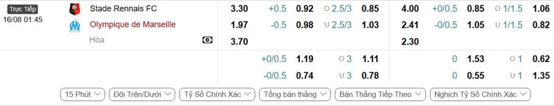 Bảng Tỷ lệ kèo bóng đá Rennes vs Marseille