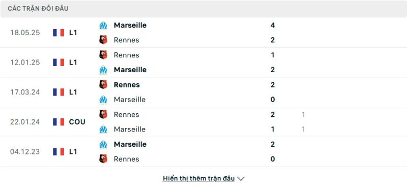 Thành tích đối đầu của Rennes vs Marseille