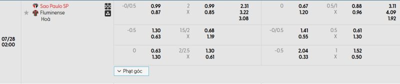 Bảng Tỷ lệ kèo bóng đá São Paulo vs Fluminense