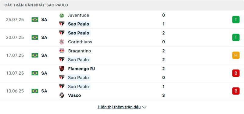5 trận gần nhất của São Paulo: W-W-D-L-L