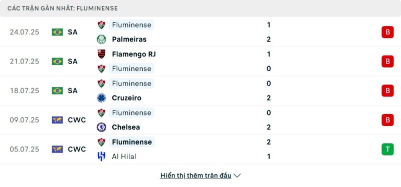 5 trận gần nhất của Fluminense: L-L-L-L-W