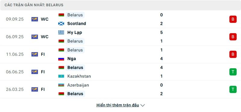5 trận gần nhất của Belarus: L-L-L-W-W