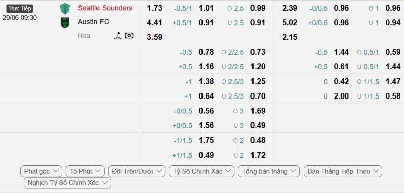 Bảng Tỷ lệ kèo bóng đá Seattle Sounders FC vs Austin FC