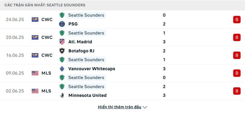 5 trận gần nhất của Seattle Sounders FC: L-L-L-L-L