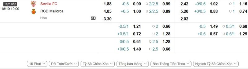 Bảng Tỷ lệ kèo bóng đá Sevilla vs Mallorca