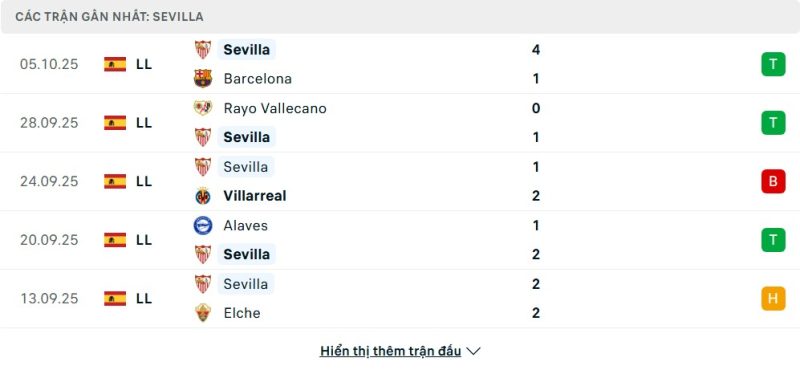 5 trận gần nhất của Sevilla: W-W-L-W-D