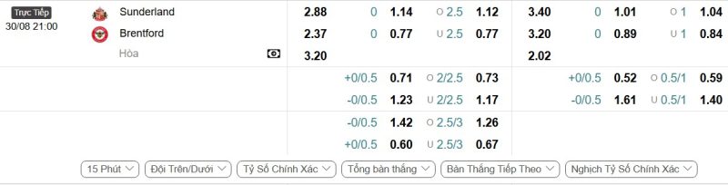 - Kèo tỷ số bóng đá hiệp 1: Sunderland 0-2 Brentford