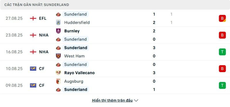 Thống kê phong độ gần đây Sunderland vs Brentford