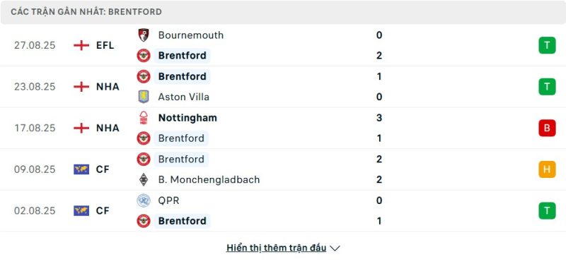 5 trận gần nhất của Brentford: W-W-L-D-W