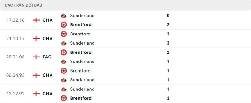 Thành tích đối đầu của Sunderland vs Brentford