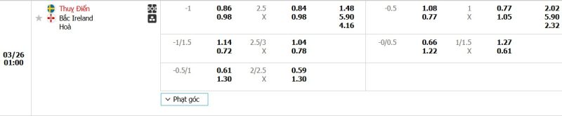 Bảng Tỷ lệ kèo bóng đá Thụy Điển vs Bắc Ireland
