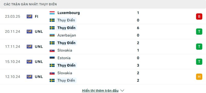 5 trận gần nhất của Thụy Điển: L-W-W-W-D
