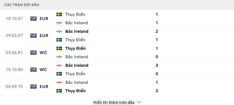 Thành tích đối đầu của Thụy Điển vs Bắc Ireland